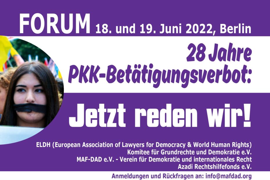 Am 18./19. Juni wird ein spannendes Forum zum PKK-Betätigungsverbot in Berlin stattfinden. Am ersten Tag werden verschiedenste Betroffene des Verbots sprechen und am zweiten Tag… Weiterlesen »„28 Jahre PKK-Betätigungsverbot: Jetzt reden wir!“